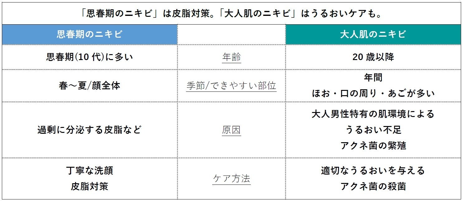 「思春期のニキビ」は、過剰な皮脂分泌による毛穴詰まりが主な原因で、丁寧な洗顔や皮脂対策が必要とされています。一方、「大人肌のニキビ」は、乾燥しやすい大人男性特有の肌環境とアクネ菌の繁殖が主な原因とされ、思春期のニキビ同様に丁寧な洗顔や皮脂対策はもちろん重要ですが、それに加え、ニキビを防ぐ有効成分が配合されたスキンケアで、十分なうるおいを与えることが必要とされています。