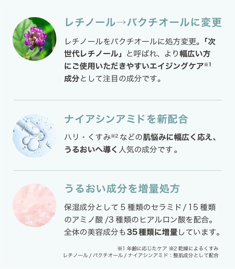 次世代レチノールとも呼ばれる整肌成分「バクチオール」、 パッと明るい印象に導く※3 大注目の成分「ナイアシンアミド」などの成分を配合しました。美容成分も25種類から35 種類と贅沢に追加。本気のエイジングケア※4をさらに後押しします。