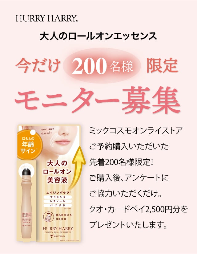 “あなたの愛着No.1コスメ”を目指し、お客様の声から商品開発を行う化粧品メーカー、株式会社ミックコスモは、気になる口もとの年齢サインをケアする美容液「ハリーハリー 大人のロールオンエッセンス」を3月下旬よりオンラインストア、全国のバラエティストアにてリニューアル先行発売!また、今だけ!あなたのお肌でお試しいただける「200名様モニターキャンペーン」を開催します!