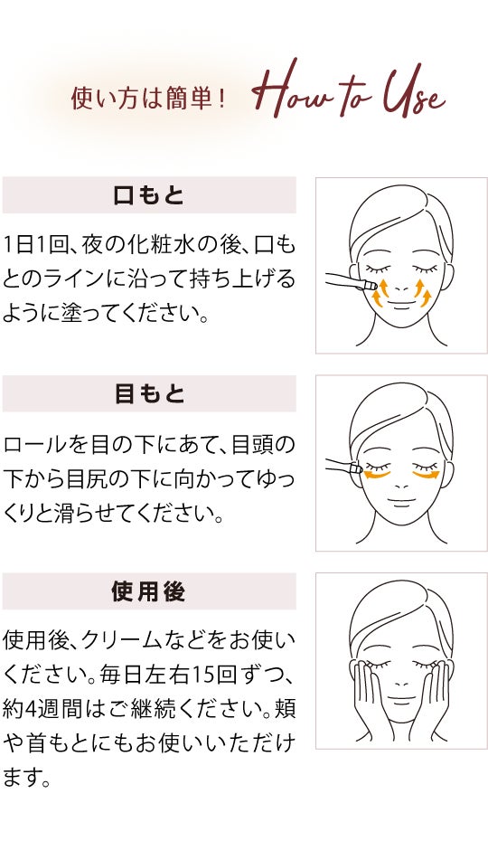 1日1回、夜の化粧水の後、口もとのラインに沿って持ち上げるように塗ってください。