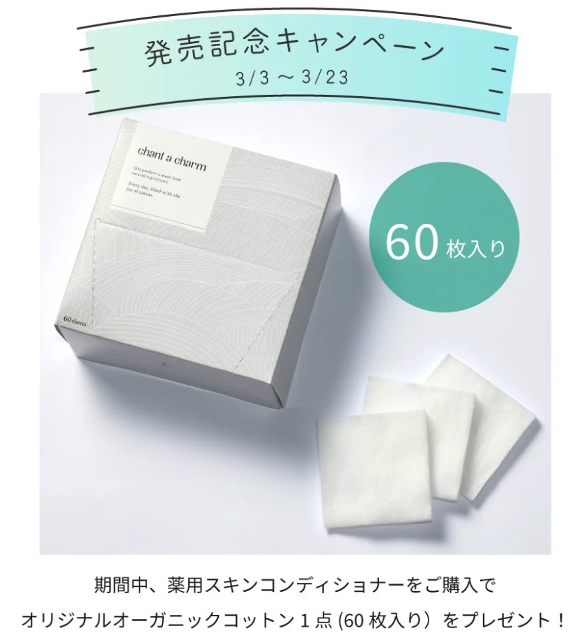 国産・オーガニックコスメブランド【チャントアチャーム】の薬用化粧水『薬用スキンコンディショナー』が遂に3月24日から待望の定番化が決定。先行期間中、公式オンラインショップでご購入された方に「オリジナルオーガニックコットン」をプレゼント。