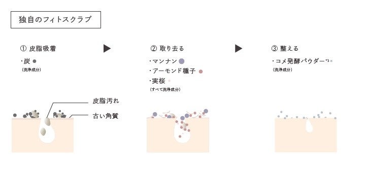 天然素材と柔らかな感触にこだわった独自のフィトスクラブ*3が、クッション効果で肌を守りながら、古い角質や毛穴に詰まった汚れまですっきりと落とします。