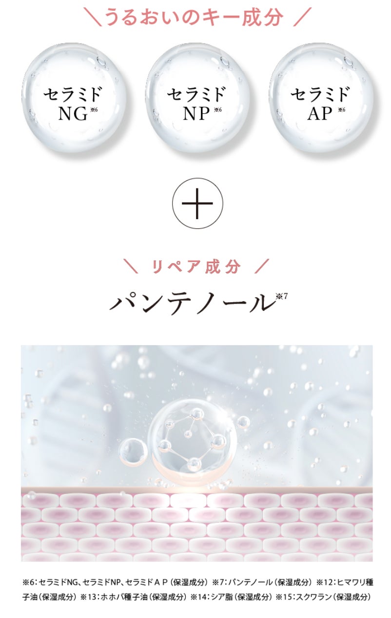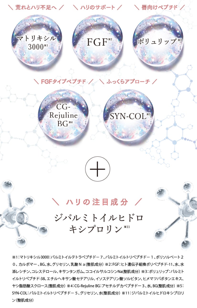 ※1:マトリキシル3000:パルミトイルテトラペプチド-7、パルミトイルトリペプチド-1、ポリソルベート2 0、 カルボマー 、BG、水、グリセリン、乳酸Na(整肌成分) ※2:FGF:ヒト遺伝子組換ポリペプチド-11、水、水 添レシチン、コレステロール、キサンタンガム、ココイルサルコシンNa(整肌成分) ※3:ボリュリップ:パルミト イルトリペプチド-38、エチルヘキサン酸セテアリル、イソステアリン酸ソルビタン、ヒメマツバボタンエキス、 ヤシ脂肪酸スクロース(整肌成分) ※4:CG-Rejuline BG:アセチルデカペプチドー3、水、BG(整肌成分) ※5: SYN-COL:パルミトイルトリペプチド-5、グリセリン、水(整肌成分)※6:セラミドNG、セラミドNP、セラミドAP(保湿成分) ※7:パンテノール(保湿成分)※8:パルミチン酸レチノール(整肌成分) ※9:フラーレン(整肌成分) ※10:テトラヘキシルデカン酸アス コルビル(整肌成分) ※11:ジパルミトイルヒドロキシプロリ ン(整肌成分)※12:ヒマワリ 種子油(保湿成分) ※13:ホホバ種子油(保湿成分) ※14:シア脂(保湿成分) ※15:スクワラン(保湿 成分)※16:乾燥によってくすんでみえる状態 ※17:シトルリン(整肌成分) ※18:トコフェ ロール(整肌成分)