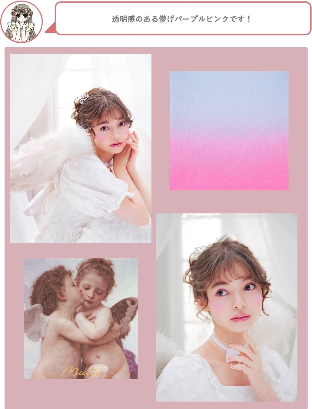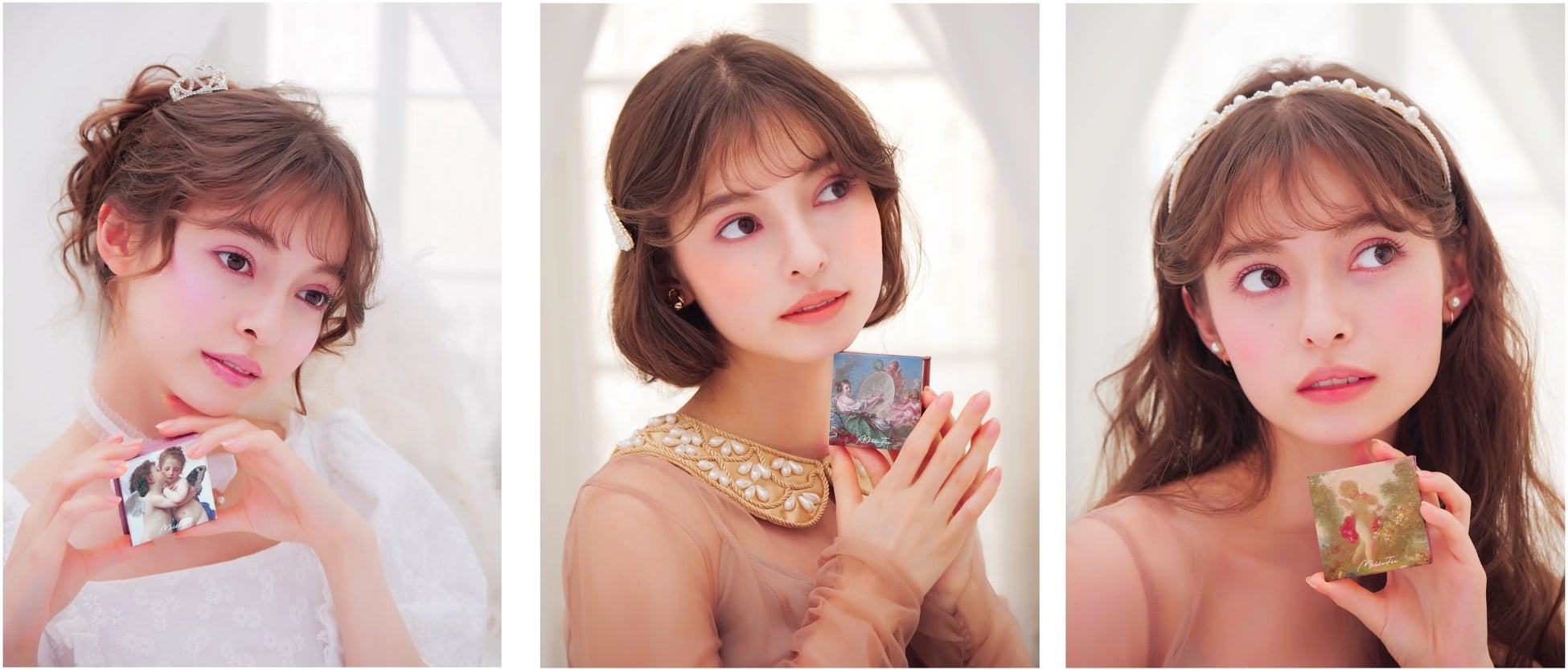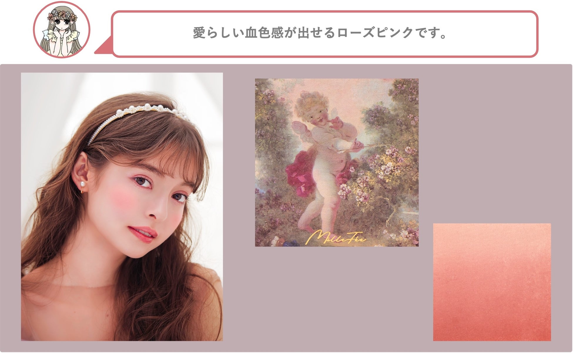 MilleFéeはこれまで、メインとなる『絵画アイシャドウパレット』を中心に4シリーズを展開しています。そこに、新しくこの『天使の絵画チーク』が登場します。『絵画アイシャドウパレット』の第一弾と第二弾(モネシリーズ)同様に、本田ユニさんが監修してくださいました。本田さんは、「第一弾を制作していた際に、絵画のモデルの頰の血色感が、とても美しいことに改めて気がつきました。特に頬のぽわっとしたぬくもり感が際立つ天使の絵画で、綺麗な血色感と立体感を演出できるチークを作りたいと思い、制作することになりました」とコメントしています。