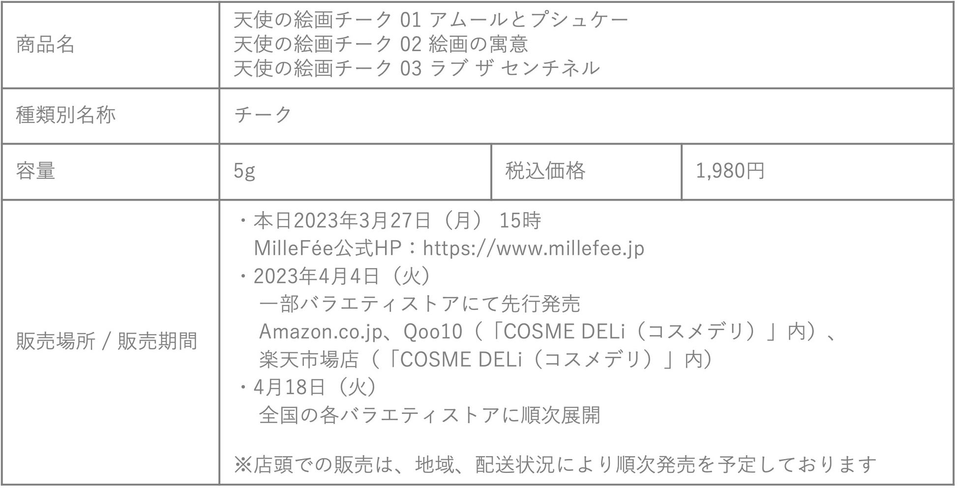 ミルフィー株式会社は、「海外トレンド×日本企画」をテーマとしたブランド『MilleFée (ミルフィー)』より、新シリーズ『天使の絵画チーク』を発売します。公式HPで3月27日(月)15時より一般に先駆けて販売を開始。また、4月4日(火)に一部バラエティストアで先行発売し、Amazon.co.jp、Qoo10、楽天市場店でも展開。さらに4月18日(火)には全国の各バラエティストアでも、順次購入可能になります。