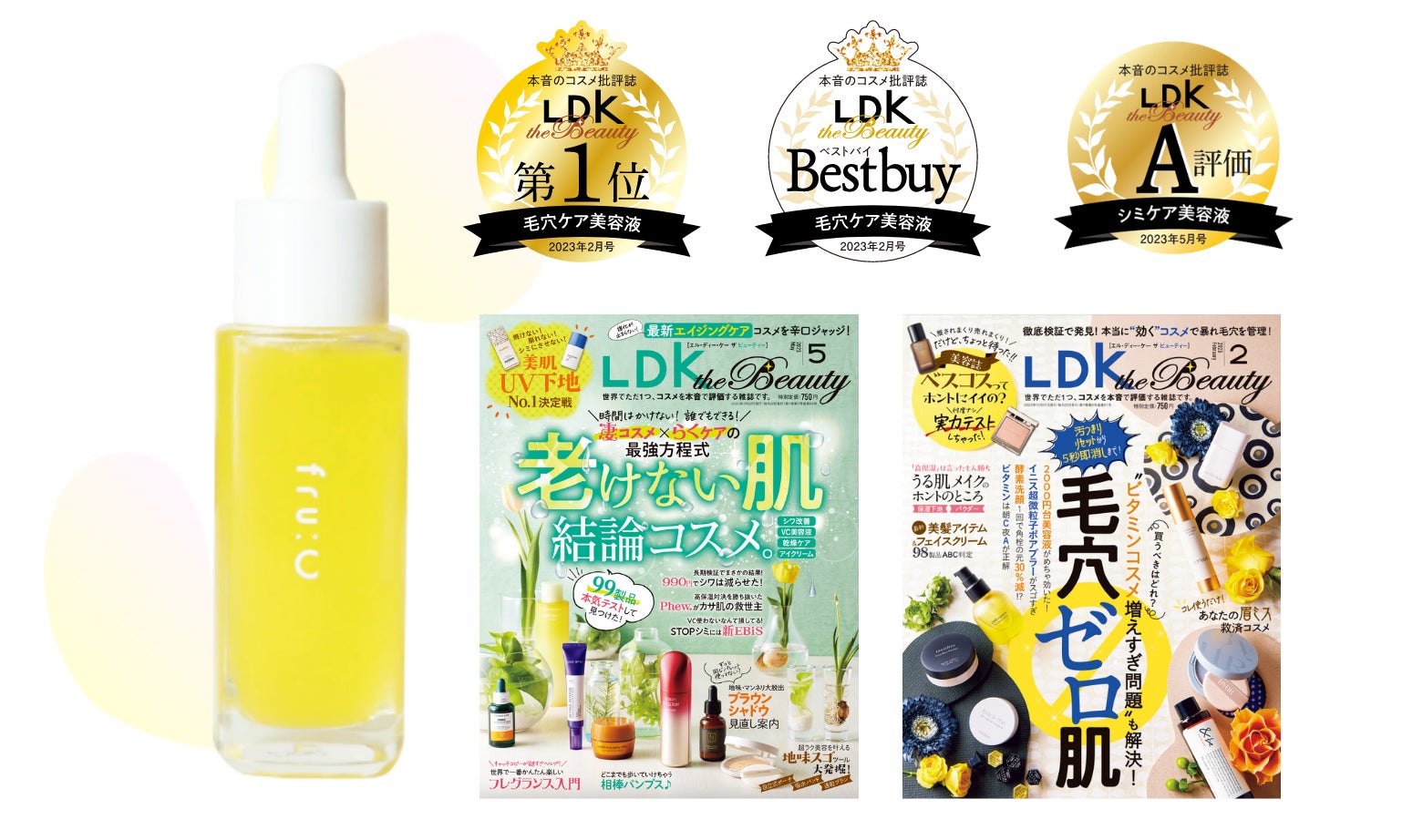 2023年2月発売の〈毛穴ゼロ肌 完全コントロール〉特集の美容液部門でも1位を獲得した『fru:C』。今年に入り2度目の受賞となり【LDK the Beauty 3冠】を達成。