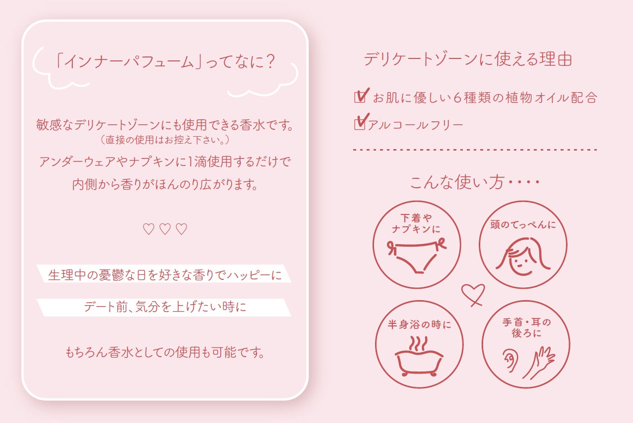 フォエリー インナーパフュームは敏感なデリケートゾーンにも使用できるやさしい香水です。アンダーウェアやナプキンに1~2滴使用するだけで香りがほんのり広がります。