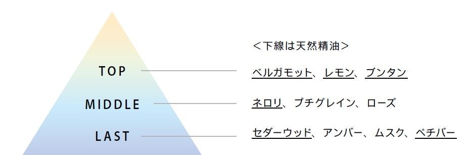 キーノートとなるシトラスとウッディには、上質さを感じられる天然精油を使用。