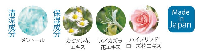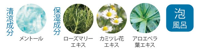保湿成分海藻エキス(ヒバマタエキス)と清涼成分メントール配合。爽快感のある涼しい湯上がりをお楽しみください。