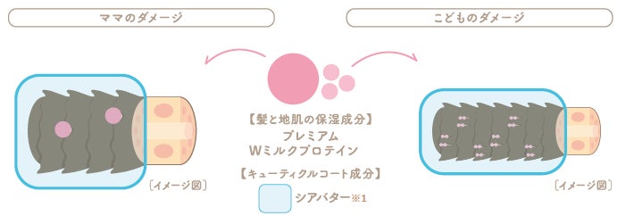 “たんぱく質”を豊富に含むミルク由来成分で、おとなと子どもの異なるダメージの両方を補修し、毛先までうるおい、からまない、指どおりツルンとした髪へ導きます。