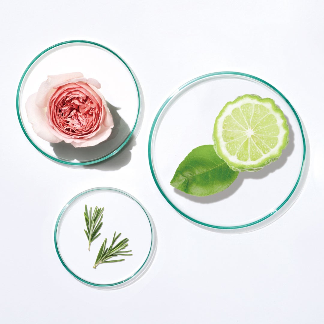 ベルガモット果実油・ニオイテンジクアオイ油・ロー ズマリー葉油・トウシキミ果実/種子油・ダマスクバラ花油といった5種類の精油をブレンド。使うたびに気持ちにも同時にアプローチします。