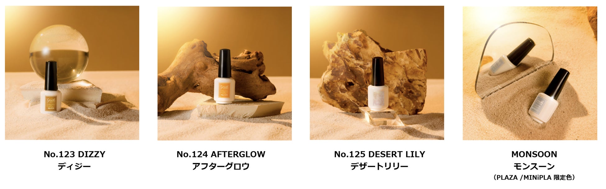 ピンクラメとゴールドラメが上品に輝きエキゾチックな雰囲気を醸し出す「 No.123 ディジー」、とろりとしたボヘミアンオレンジにチラチラと光る青ラメがエモーショナルな「 No.124 アフターグロウ」、ピンクオレンジの偏光パールが眩しく輝く「No.125 デザートリリー」、多色のラメパールが幻想的な光を放つミストブルー「モンスーン」の4 色展開。( ※「モンスーン」はPLAZA /MINiPLA 限定カラー)