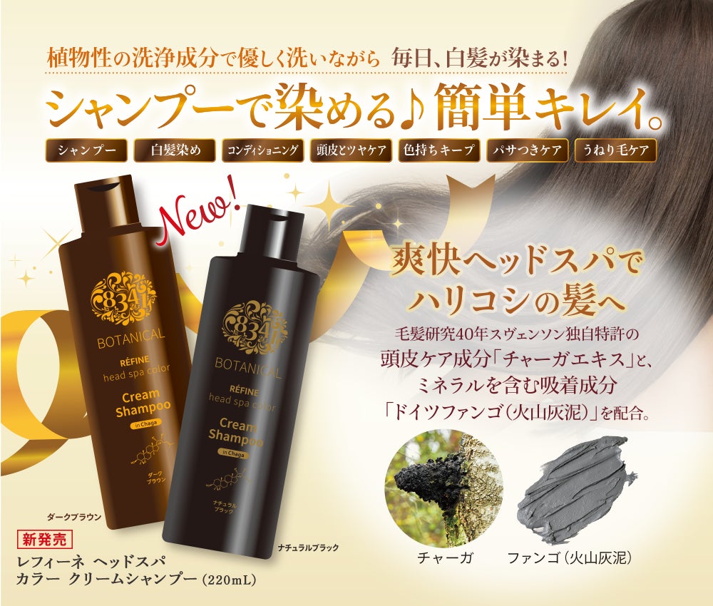 以前より、「レフィーネ ヘッドスパ トリートメントカラー」をご使用いただいているお客様から、ヘッドスパしながら白髪染めができる「シャンプー」を求める声が多く、今回、お客様のご要望にお応えして発売する「レフィーネ ヘッドスパ カラークリームシャンプー」は、植物性の洗浄成分で優しく洗いながら「簡単」・「キレイ」に白髪染めが可能です。