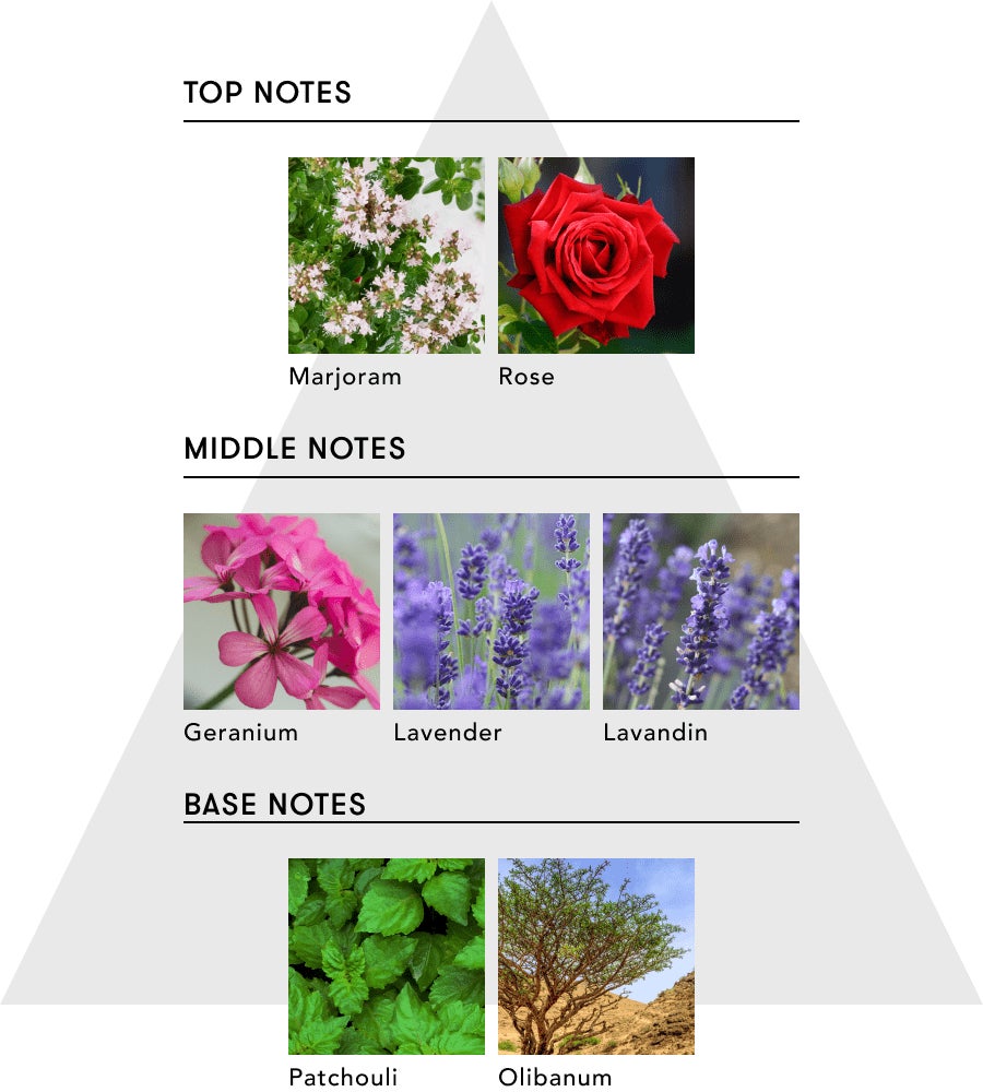 トップはマジョラムとローズが華やかな余韻を残しつつ、ミドルではゼラニウムやラベンダーなどのフローラル系が軽やかに香ります。ベースノートのパチョリ、フランキンセンスが上質で複雑に絡み合いながら、心の内側から幸福感を感じ、前向きな気持ちに導きます。