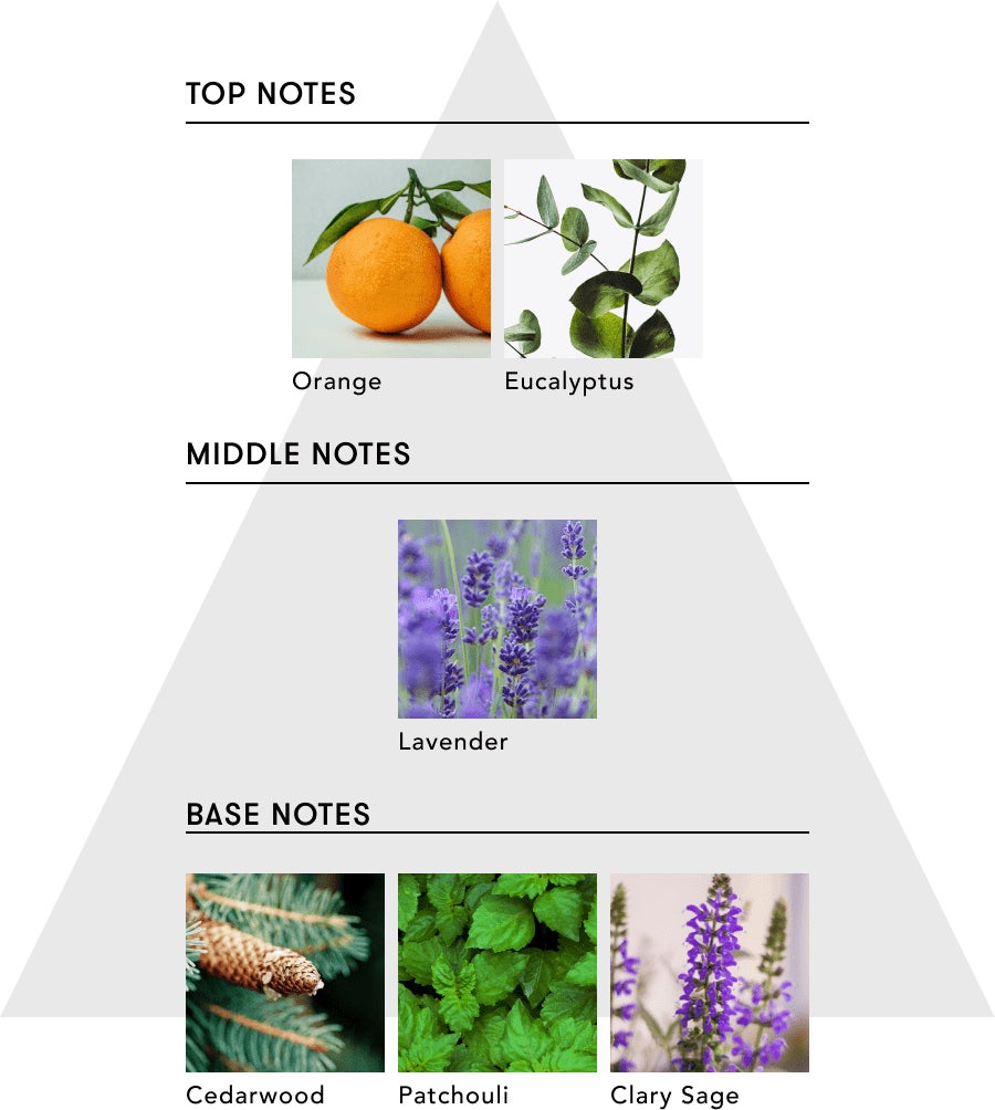 トップはフレッシュで爽やかなユーカリと幸福感を感じるオレンジ、ミドルは心を落ち着かせるラベンダーで変化を感じさせます。長く続くベースノートは、セダーウッド、 パチョリ、クラリセージが森林の中を散歩しているかのように心を洗い流し、緊張や不安をやわらげ、心のバランスを整えてくれます。
