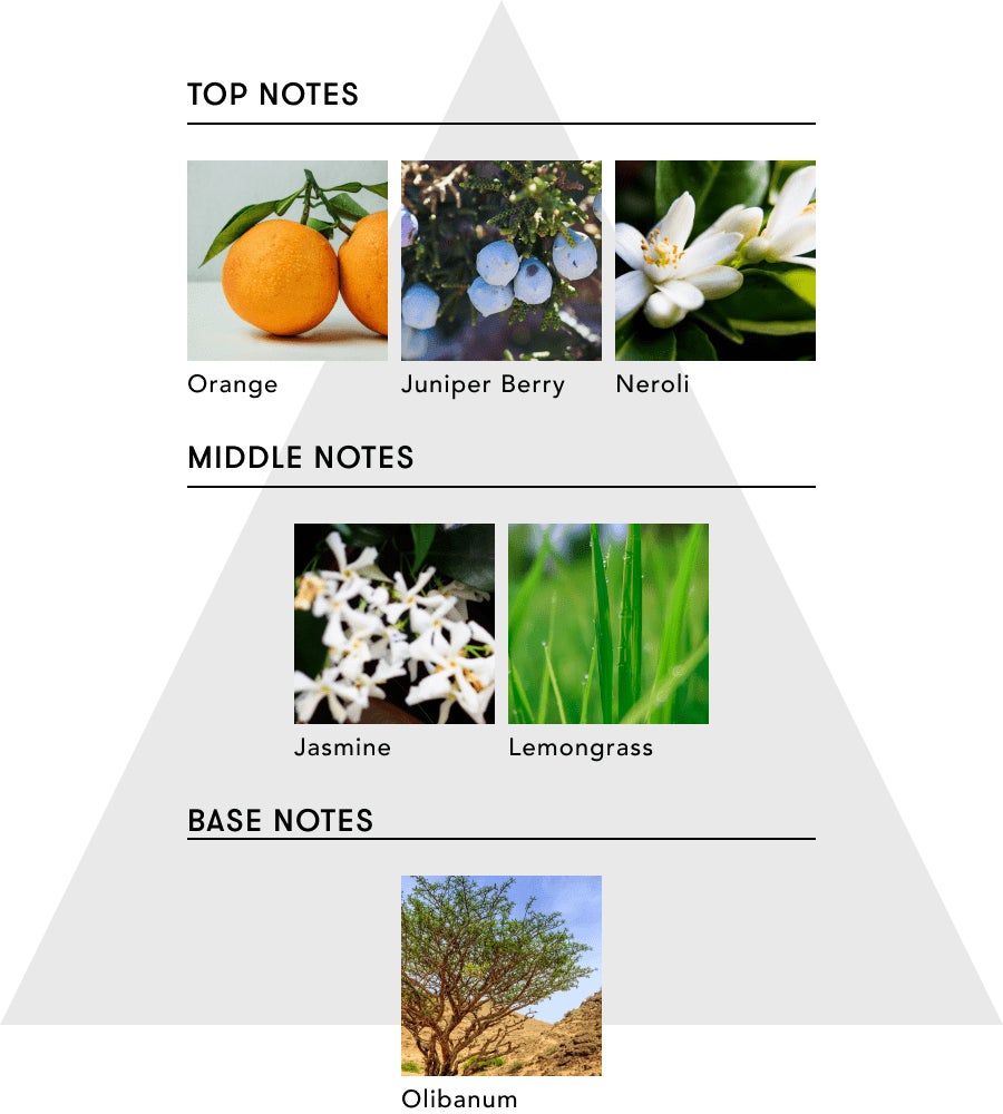 トップは爽やかで瑞々しいオレンジ、ジュニパーベリー、ネロリが気持ちを落ち着かせ前向きな気分にリフレッシュ。ミドルのジャスミンとレモングラスのすっきりとした香りがやる気を高めてくれます。ベースノートのフランキンセンスは、地に足の着いた気品のある香りが心をすーっとクリアに導き、ニュートラルな自分軸にかえしてくれます。