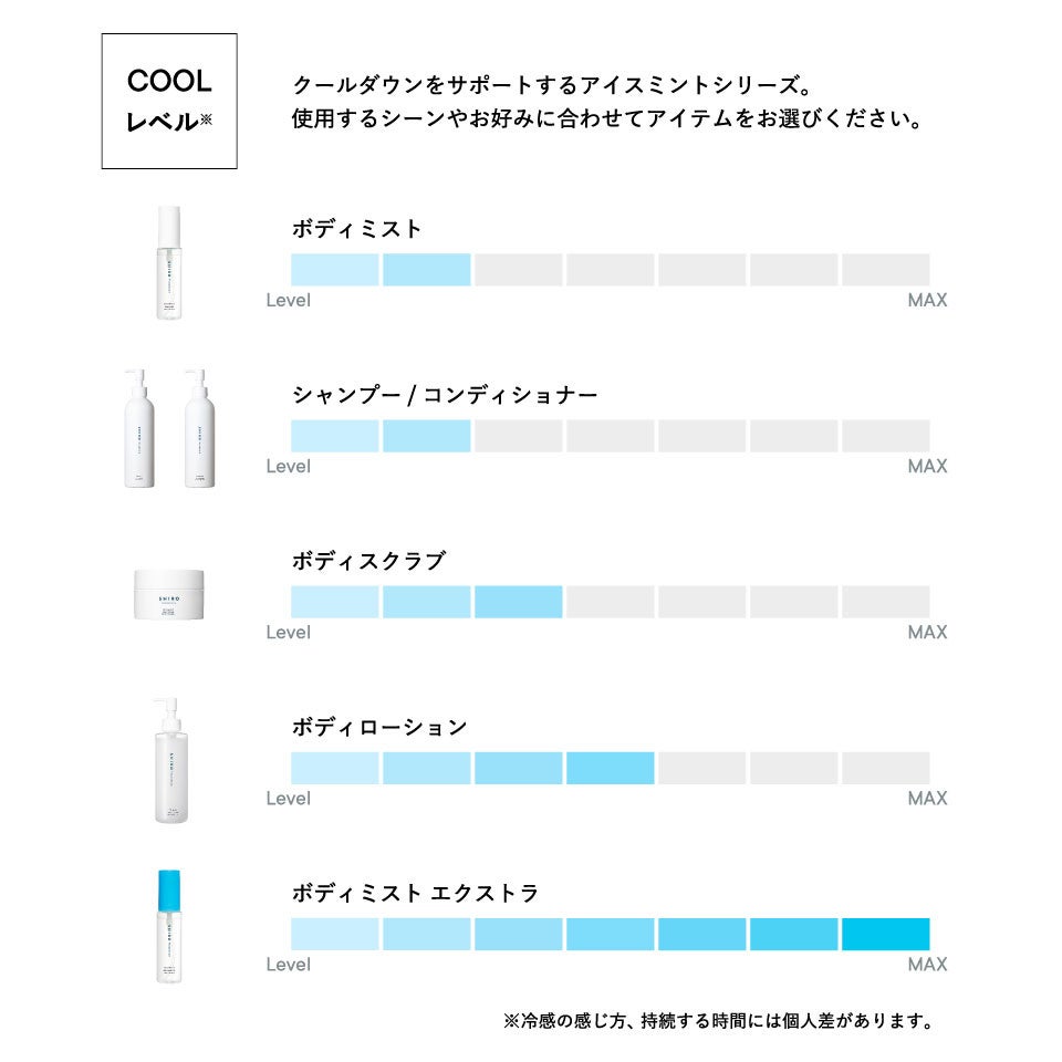 ・入浴後のボディケアとしてアイスミント ボディローションをセットでご使用いただくと、より強い爽快感でお風呂上りも快適にお過ごしいただけます。