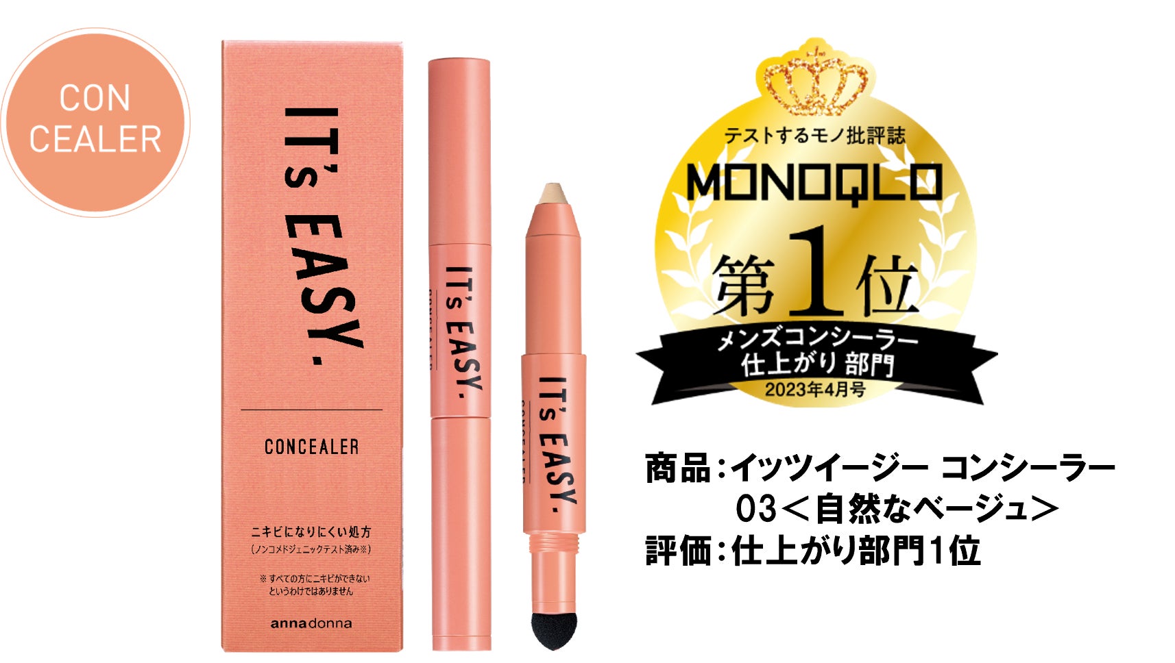 株式会社ダリヤが展開する、2022年12月に発売された「イッツイージー コンシーラー03<自然なベージュ>」が、テストするモノ誌「MONOQLO(毎月19日発売/発行部数9.5万部)」2023年4月号にて、メンズコンシーラー仕上がり部門で第1位を受賞。
