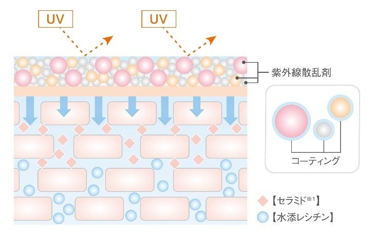 紫外線散乱剤が直接肌に触れないよう、エモリエント成分でコーティングしたノンケミカル処方を採用。