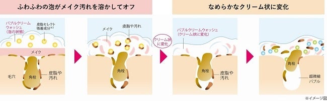 クリーム状に変化することで小さな超微細バブルとなり落ちにくい毛穴汚れをオフします。なめらかなクリーム状のためメイクとなじみ、くすみの原因となる汚れを絡めとります。