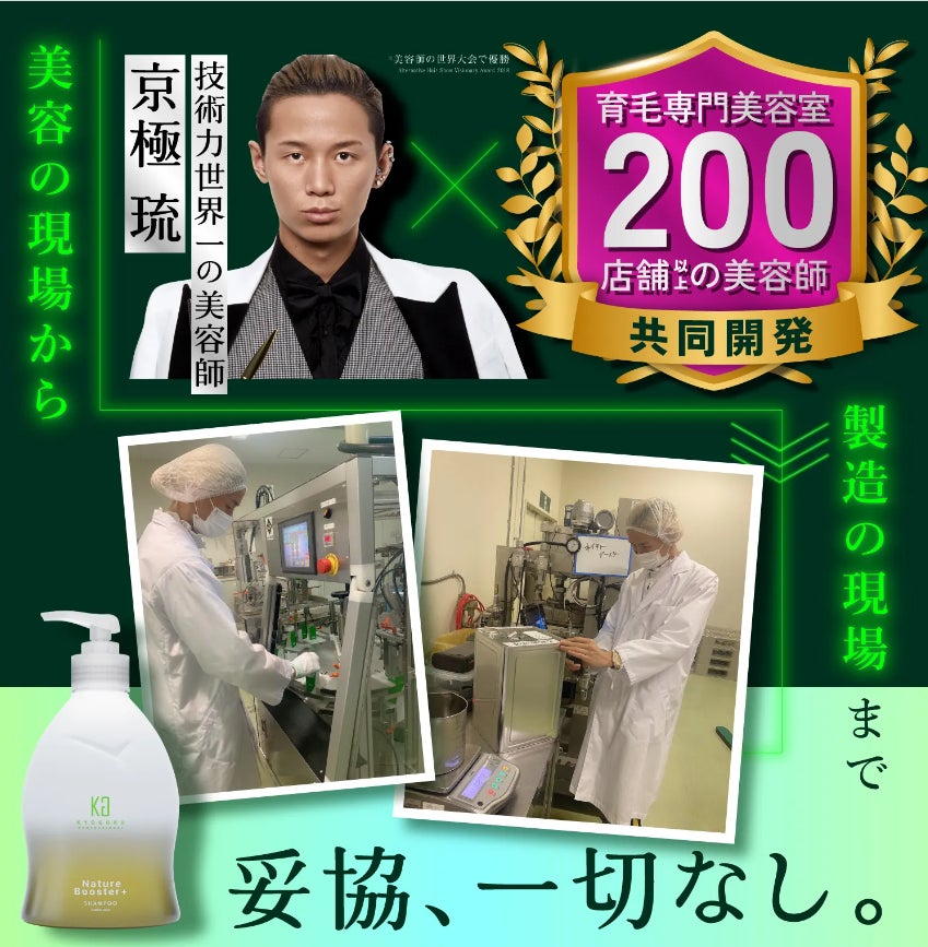 薄毛、抜け毛、AGA(男性型脱毛症)に対して、KYOGOKU PROFESSIONAL」より販売している「ネイチャーブースター」薬用育毛剤が大変好評だったことから、シャンプーとトリートメントの開発に至りました。細胞レベルで弱くなった毛髪にアプローチし、ハリ・コシ・太さを栄養素で補いボリュームのある毛髪へ導きます。