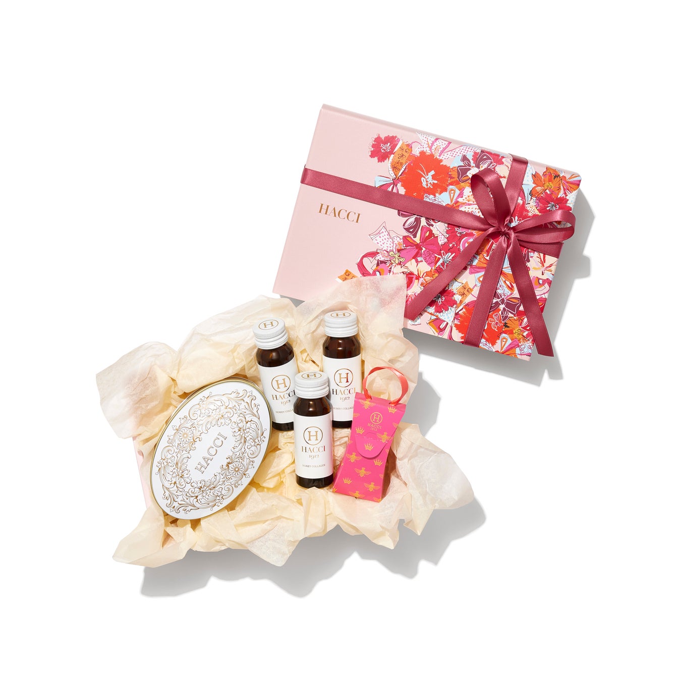 はちみつ香るナッツチョコレート『アマンドショコラ』と、ホワイトクローバーはちみつをたっぷり練り込んだ『はちみつキャンディ』、花嫁ドリンクとも名付けられたHACCIの人気美容ドリンク『ハニーコラーゲン』。すべての欲しいがアソートされたセットです。