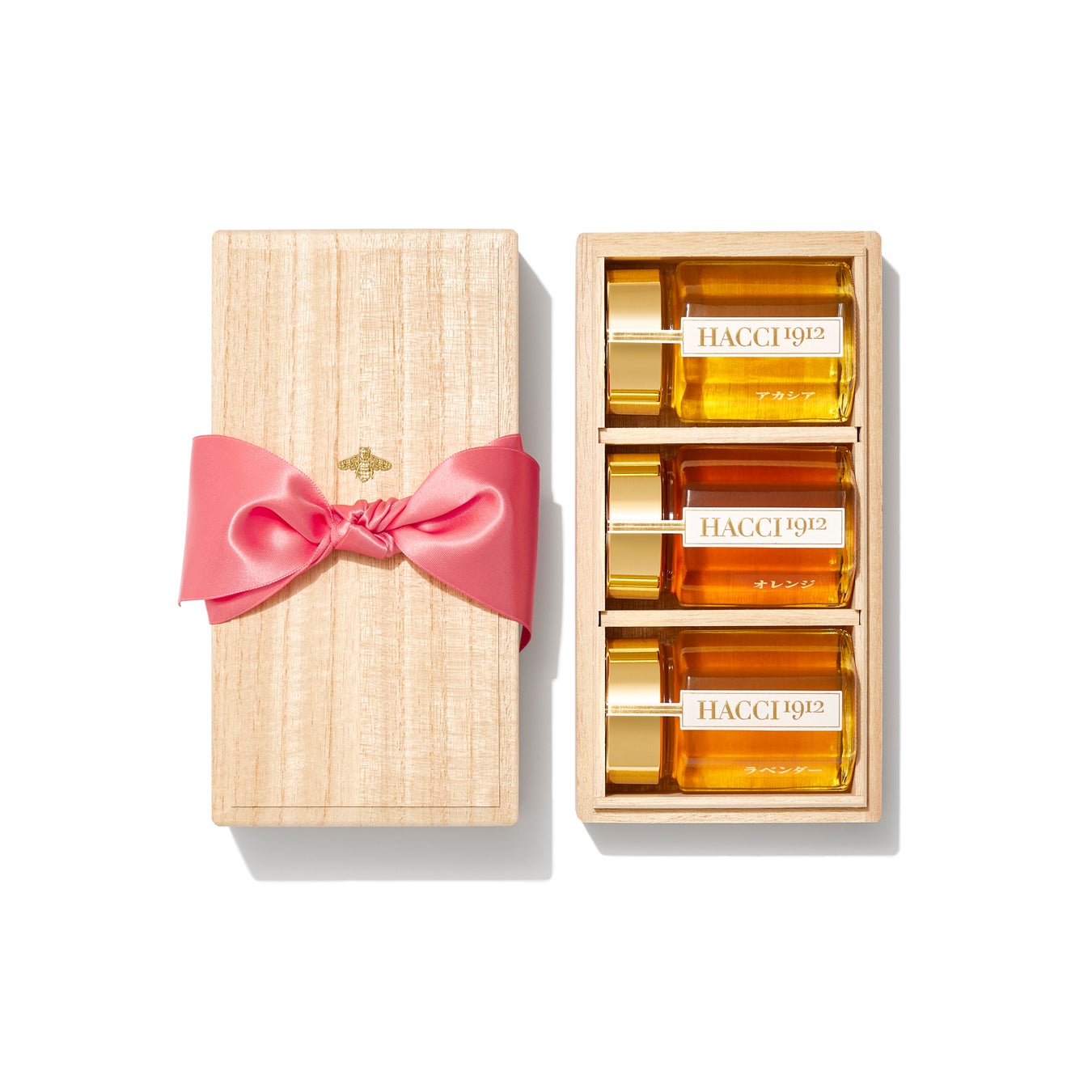 セット内容:ハンガリー産アカシア 95g、メキシコ産オレンジ 95g、スペイン産ラベンダー 95g、限定リボン付き桐箱