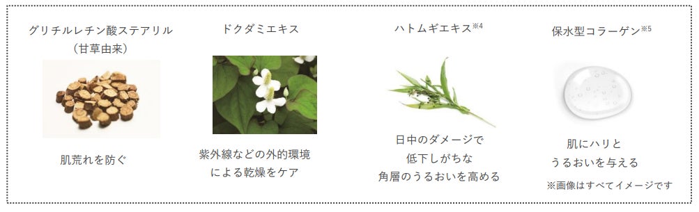 さらに、「グリチルレチン酸ステアリル」をはじめとした、和漢植物由来成分の保湿成分 3 種類を配合 し、肌荒れ予防・保湿ケアを同時に叶えます。