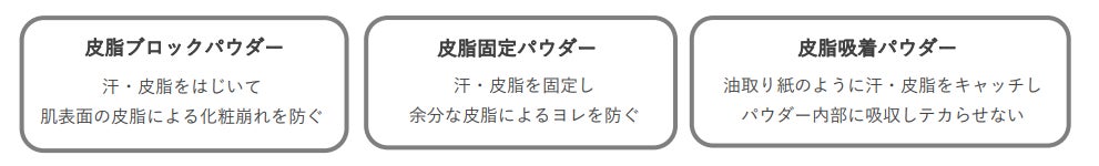 さらに、テカリ・ヨレを防止するために「3 種のオイルセンサーパウダー」 (皮脂ブロックパウダー※8・皮脂固定パウダー※9・皮脂吸着パウダー※10)を配合。 汗・皮脂によるベタつきを抑えて、サラサラな肌をキープします。