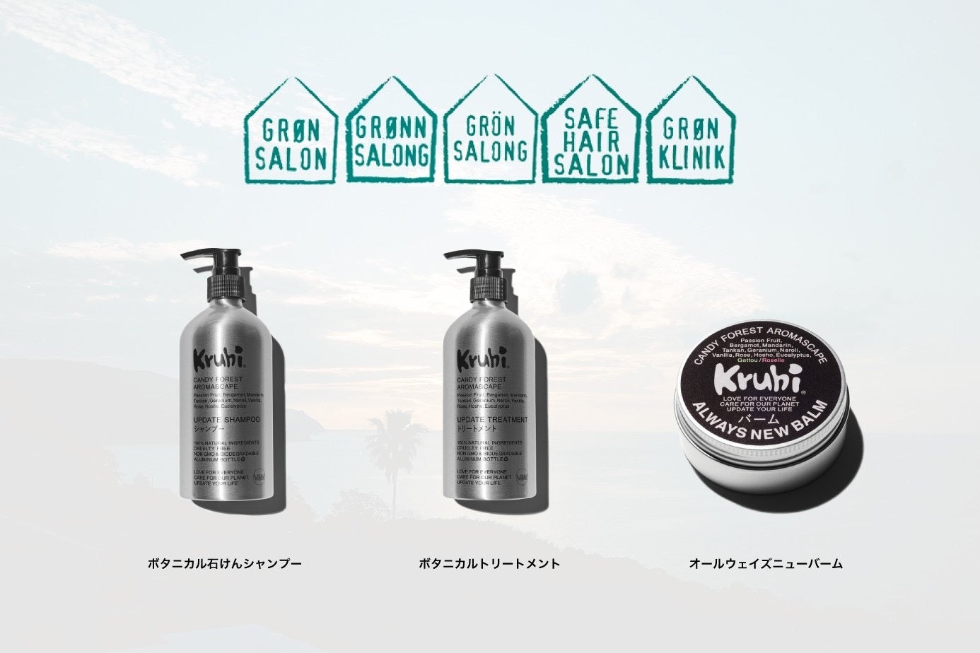 今回Grøn Salon(グリーン・サロン)認証を受けたのは、昨年9月にブランドを設立後に発売を開始した「Kruhiボタニカル石けんシャンプー」、「Kruhiボタニカルトリートメント」、続いて本年2月に発売を開始する「Kruhiオールウェイズニューバーム」の全3製品。