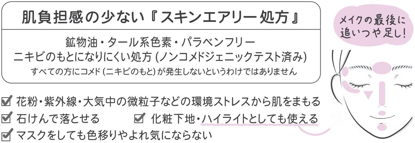 光拡散効果のある光拡散パール※1を配合し、トーンアップ効果のあるラベンダーカラーを採用することで、毛穴・くすみ・色むら・凹凸を自然にカバーし、透明感のある”立体生つや肌”を叶えます。さらに、皮脂テカリ防止成分の皮脂さらさらパウダー※3配合で、マスクをしてもメイクの色移りやよれにくい処方です。また、国内基準最高値のUVカット指数(SPF50+/PA++++)で紫外線からも肌を守ります。