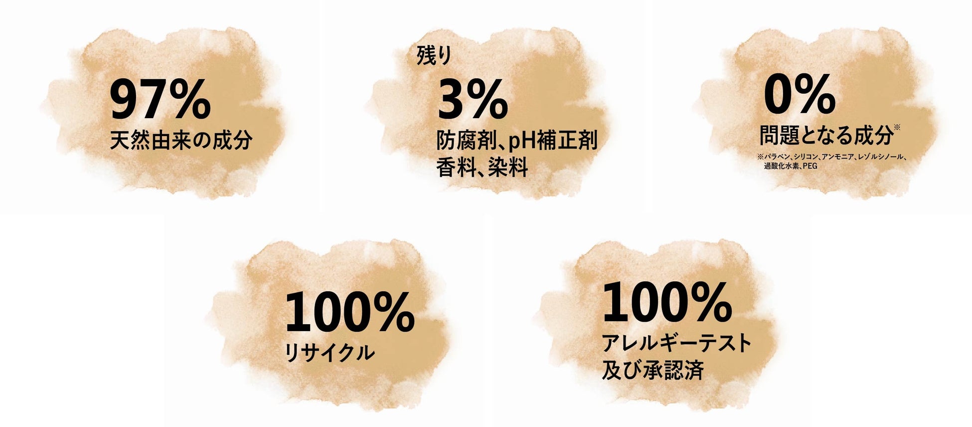 そのために自然から直接取られた純粋な成分を使用し、人にとって安全なだけでなく環境にも優しい製品を作っています。平均して97%(※1)の天然由来の成分を使用し、髪、スタイリングする手、そして地球に優しい処方を追求しています。
