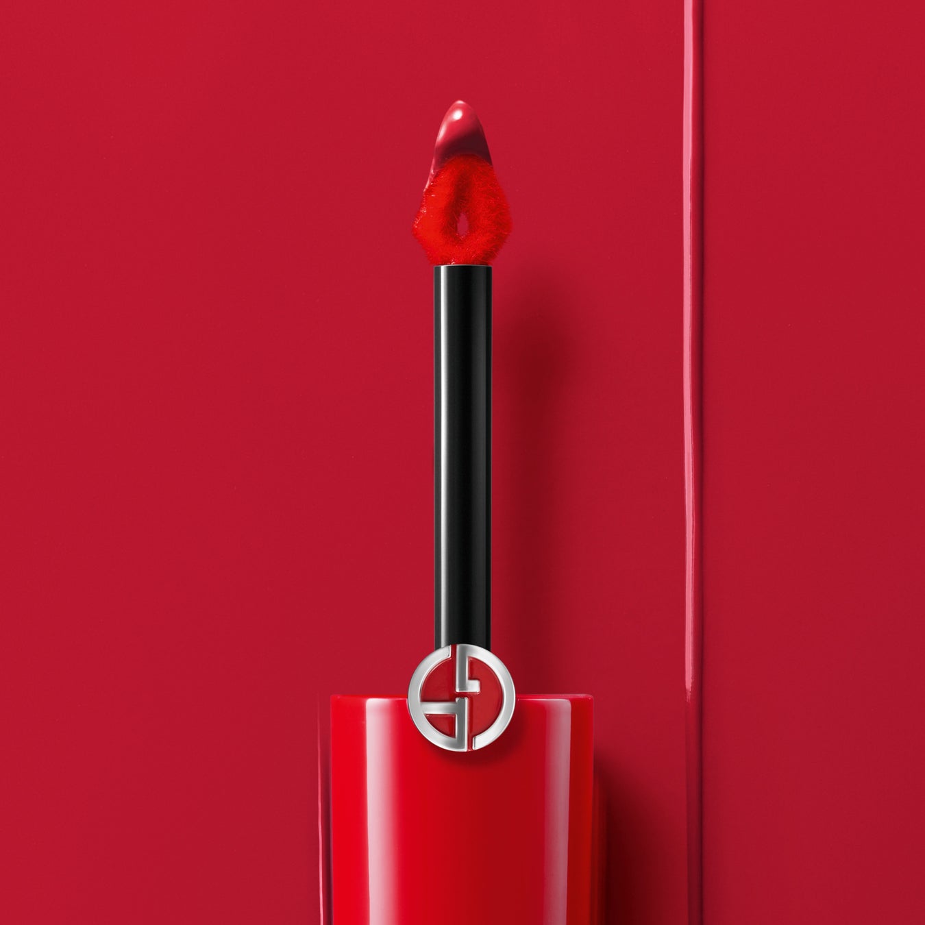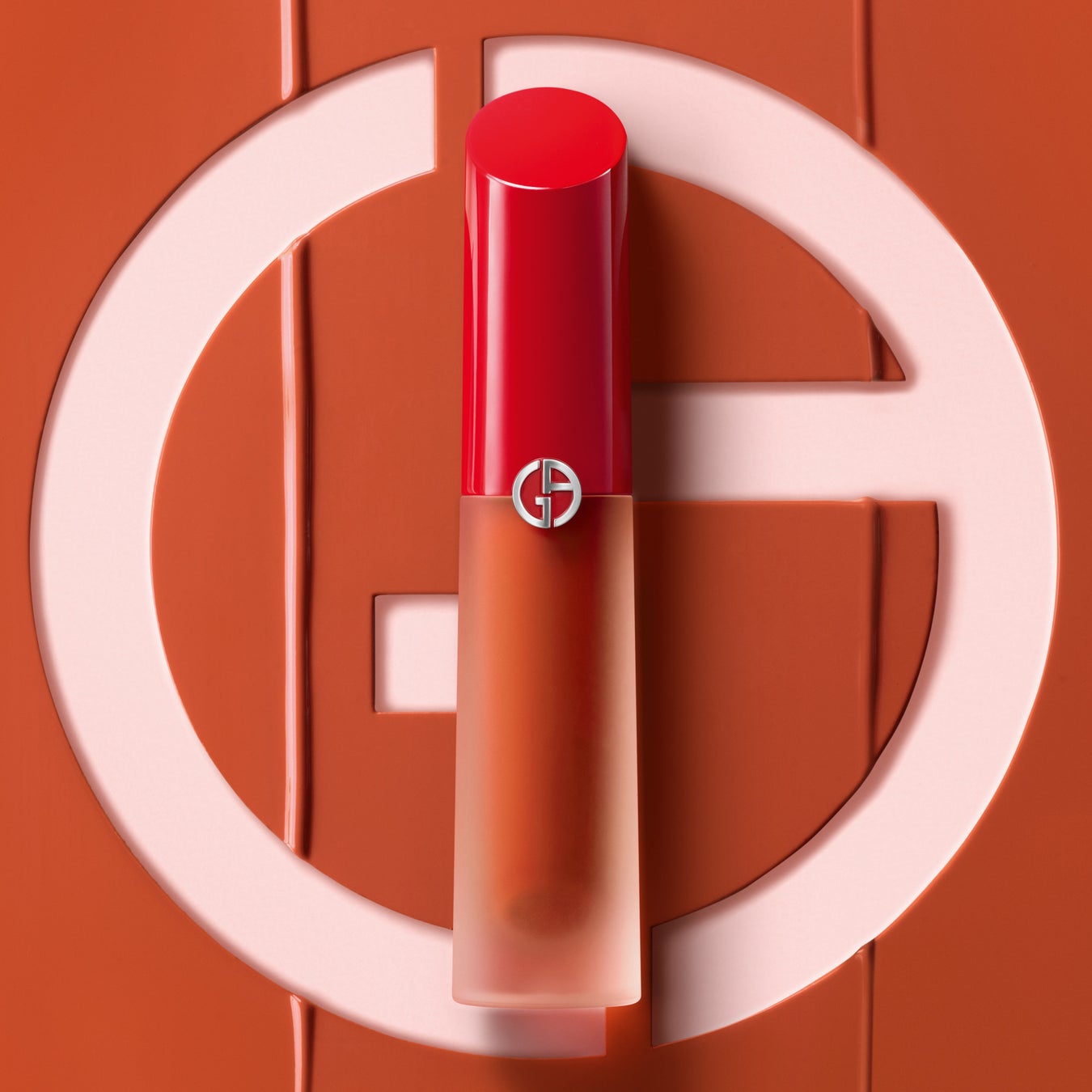 アルマーニ ビューティの特徴である楕円のボトルに、斜めにカットされたアルマーニレッドのキャップとすりガラスのようなデザインの組み合わせ。