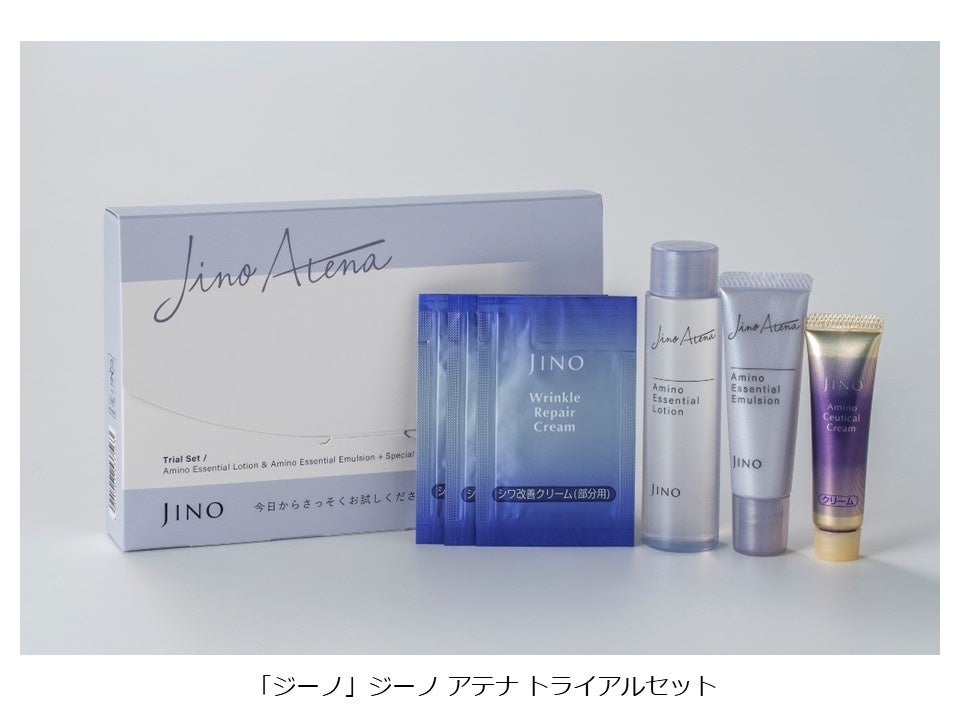 また本製品の発売に伴い、本製品および「ジーノ」最高濃度の美容成分を配合した「ジーノ」アミノシューティカル クリーム、「美肌タンパク質」をサポートするアミノ酸系成分※5を黄金比率で配合した 化粧水「ジーノ」 ジーノ アテナ アミノ エッセンシャル ローション、美容乳液「ジーノ」 ジーノ アテナ アミノ エッセンシャル エマル ジョンの4品種をトライアルセットとして、お試しサイズにて 3月1日(水)より通販サイト限定で発売します。