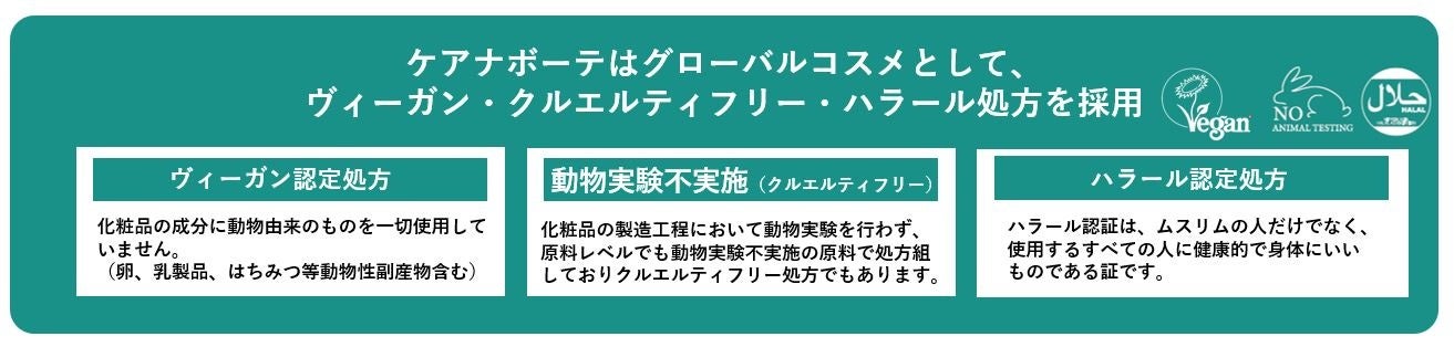 ・動物由来の成分(副産物含む)を製造工程の中で一切使用していないヴィ―ガンコスメとして、名誉ある英国のヴィ―ガンソサエティにて認定されました。また、原料段階から動物実験を行わずに作られたクルエルティフリーなコスメでもあります。ヴィ―ガン認証に加え、ムスリムの人を含むすべての人に健康的で身体にいいものである証であるハラール認証も取得しています。